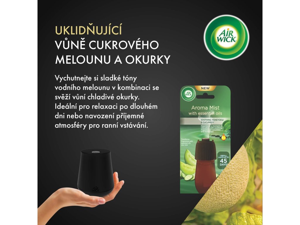 Klíčové vlastnosti náplně s vůní cukrového melounu a okurky do vaporizéru AIR WICK Aroma Mist
